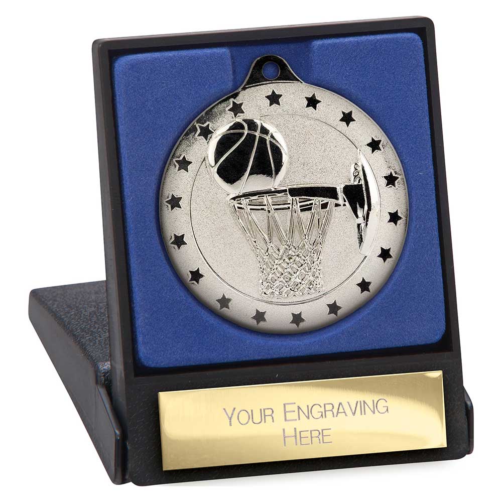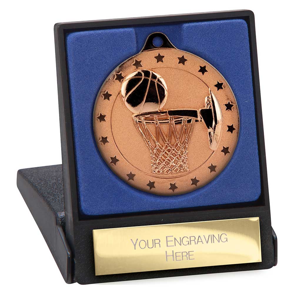 A 5cm medal featuring a basketball with a net and star accents, set against cascading stars. Supplied in a presentation box with an engraving plate for personalisation.
