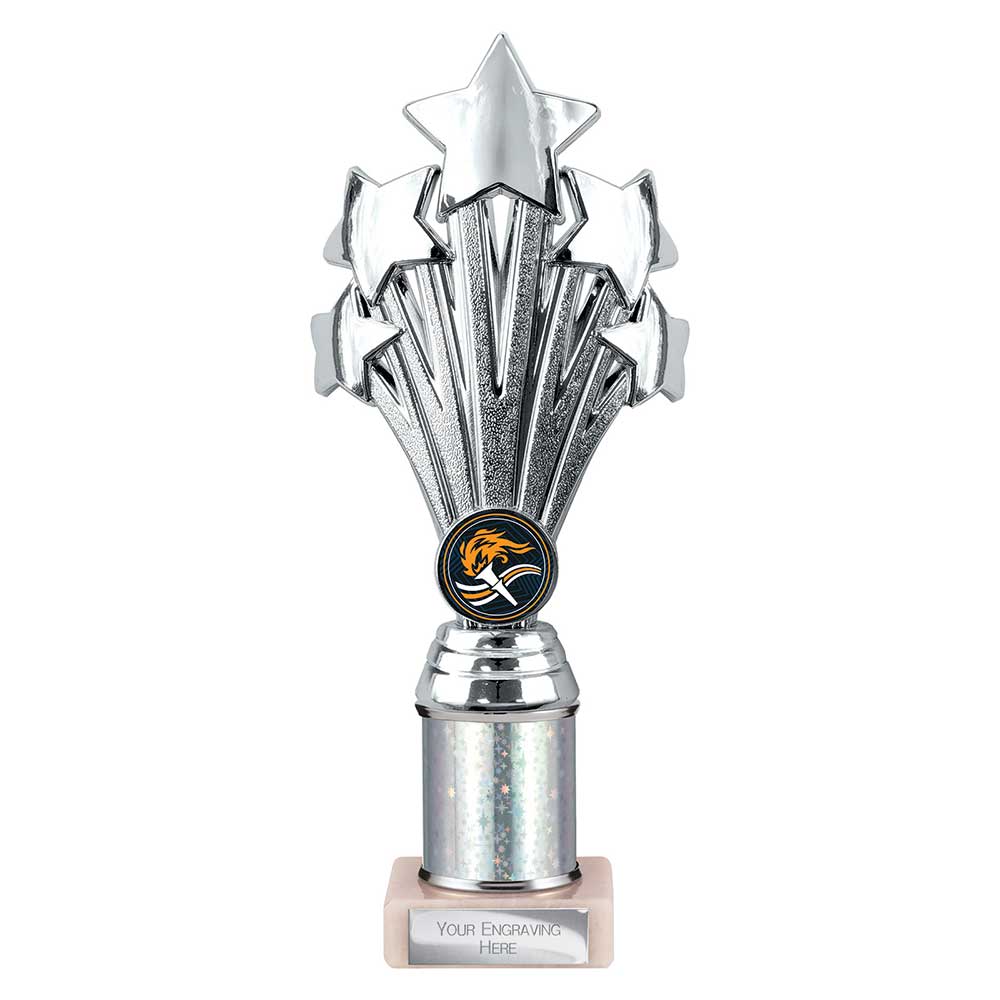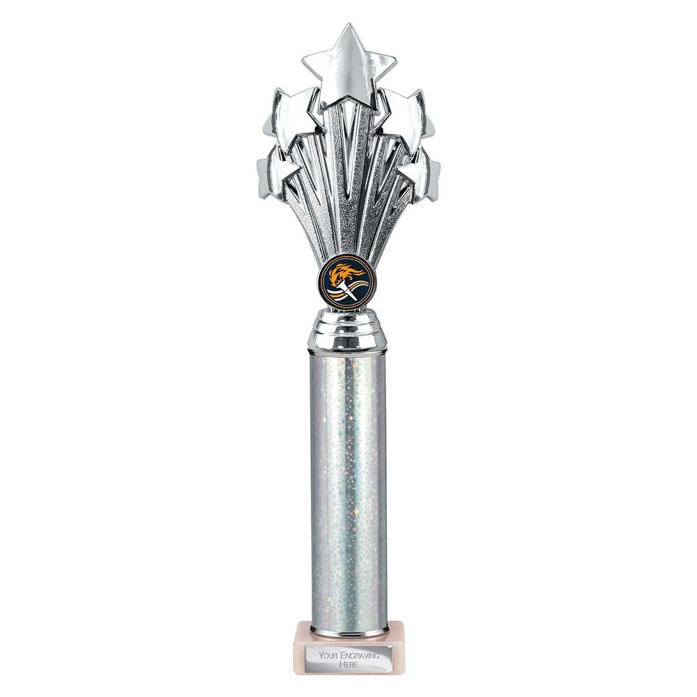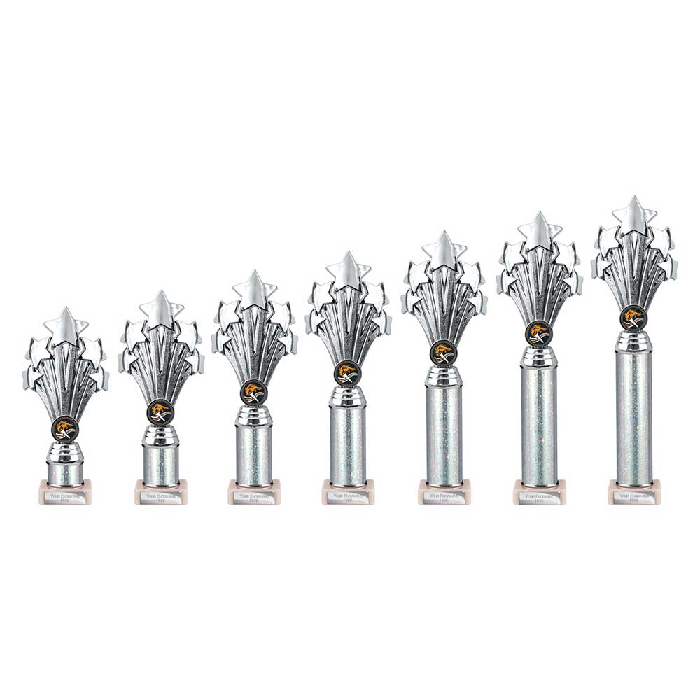 Honour top performers with this silver tube trophy. The five shooting stars fan out dynamically atop a metallic silver tube column, creating a commanding stage presence. Crafted from premium plastic with a glossy silver finish and mounted on a solid jet-black stone base, the trophy is freestanding and perfect for display.