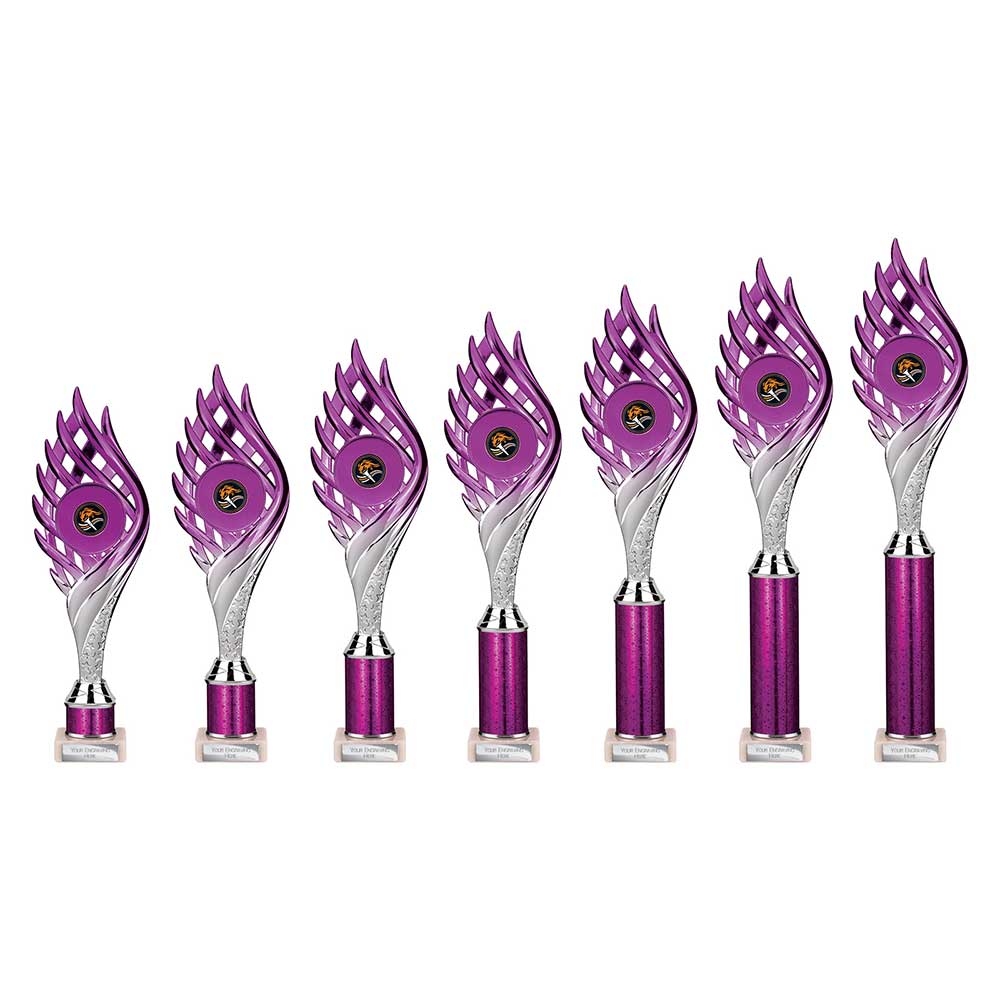 Show off a sense of prestige with this Wildfire Tube trophy in deep purple flames. Mounted on a polished silver tube column, the award conveys energy, motion, and a modern style perfect for high-achieving multisport winners.