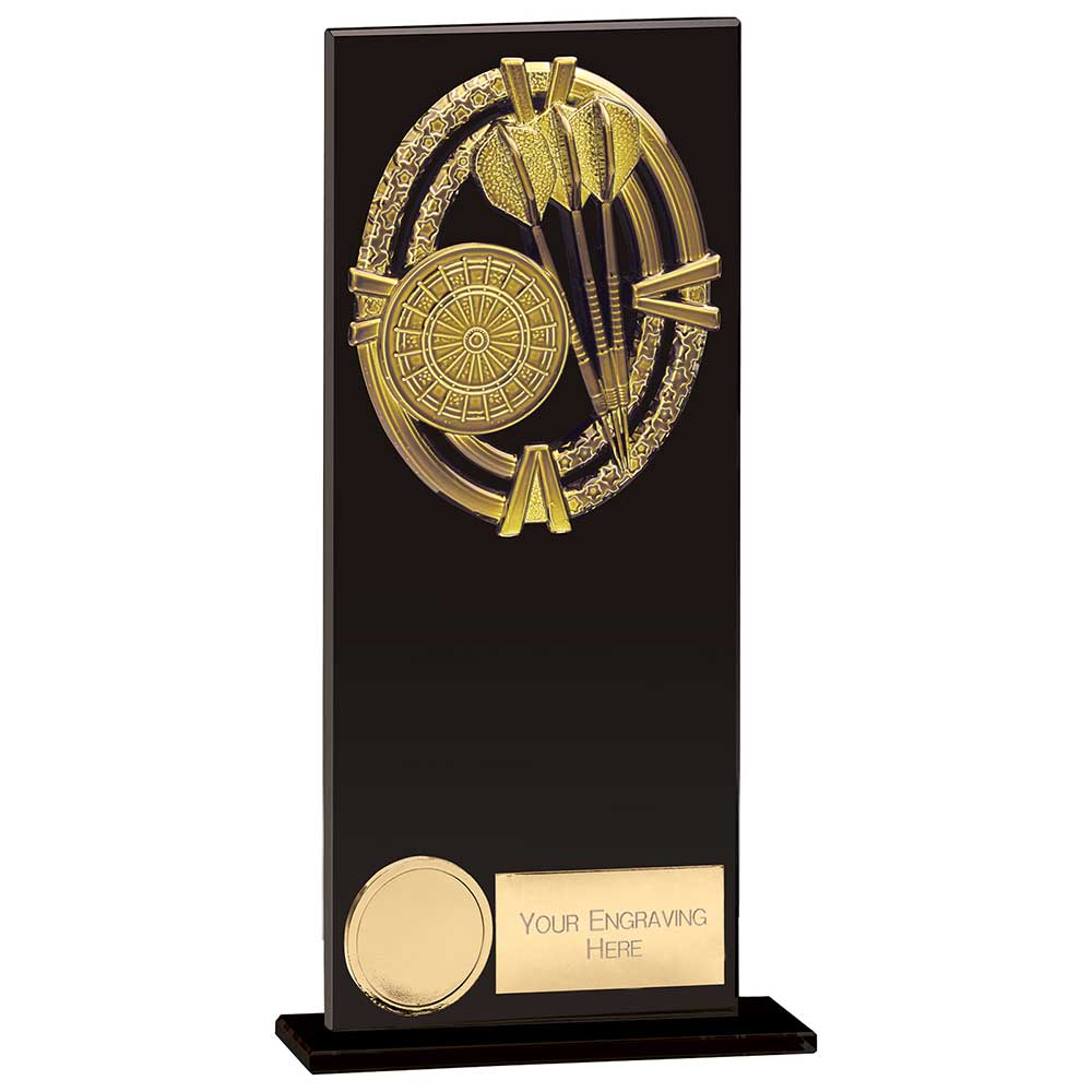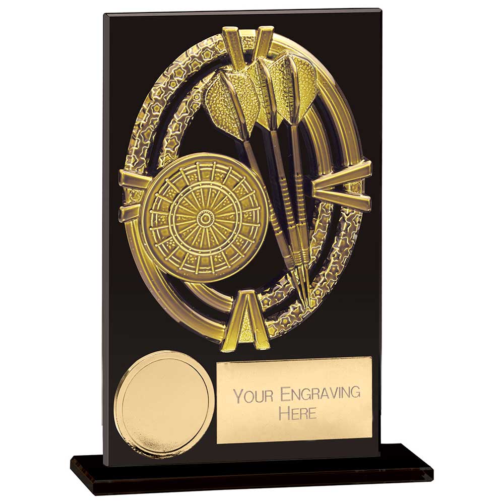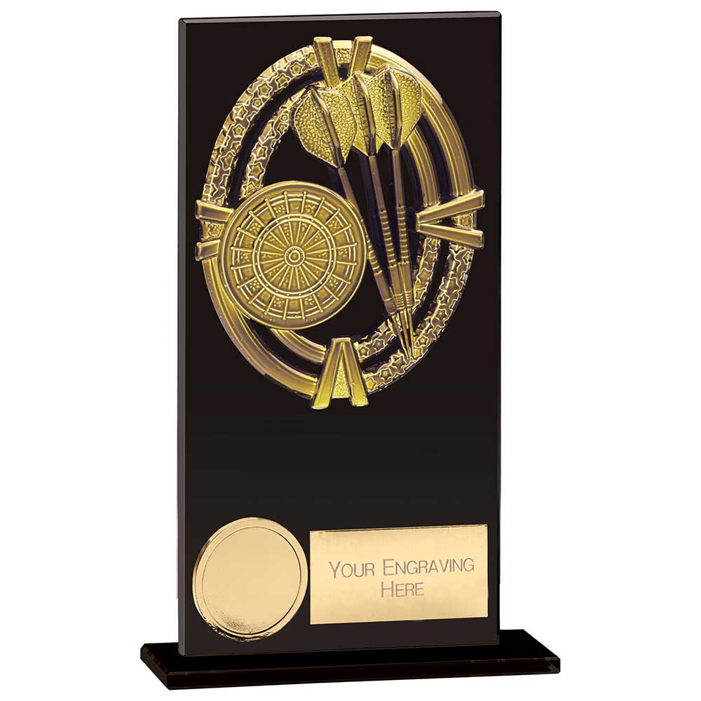 Crafted from 5mm thick jet black glass with polished edges, this award features a golden oval fascia embossed with a dartboard and three darts, mounted on a matching freestanding glass base for a sleek, professional finish.