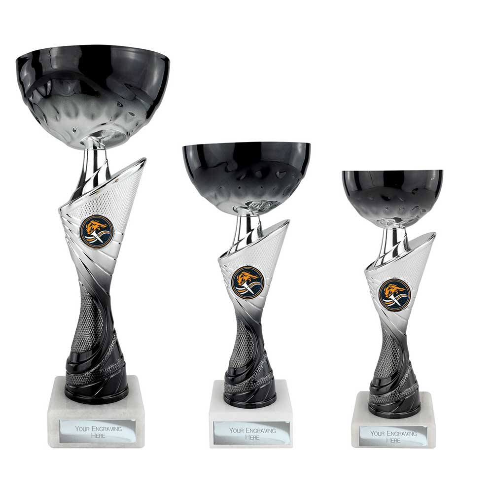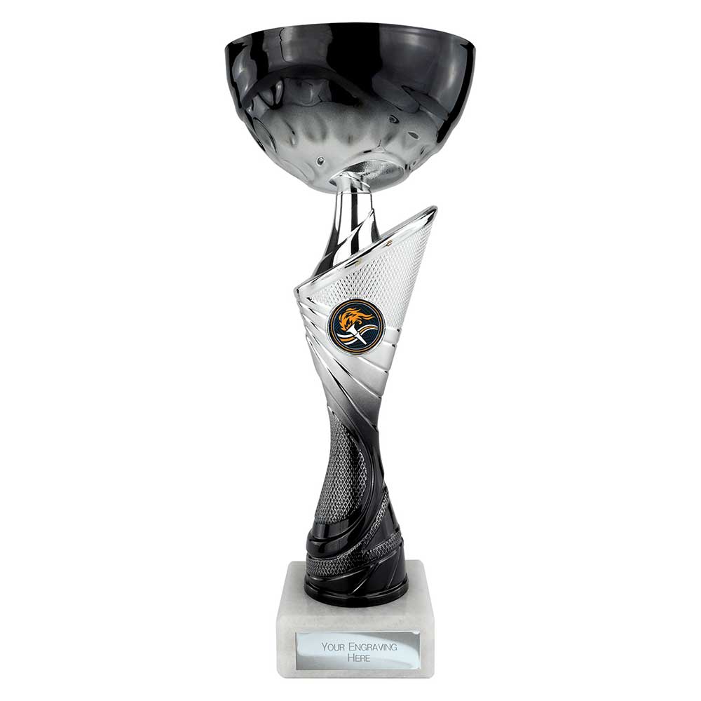 A striking combination of classic elegance and modern flair, this trophy features a polished silver cup elevated on a sculpted black-and-silver spiral column. The solid black marble base gives the award a substantial weight and professional presence, perfect for celebrating top achievements.