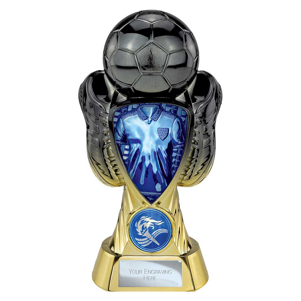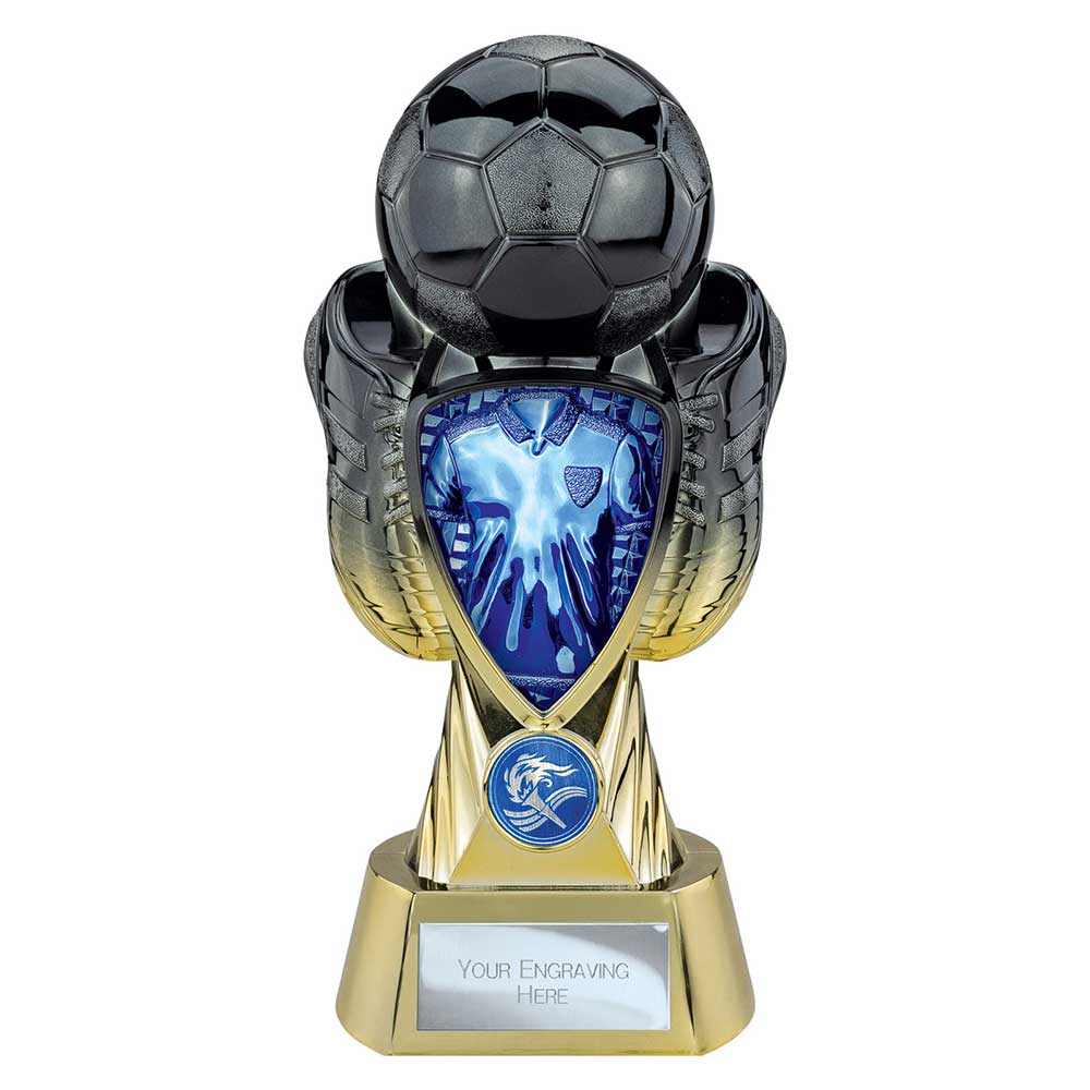 Combining deep gunmetal tones with a rich gold finish and bold blue shirt insert, this heavyweight football trophy is designed to showcase team branding with real impact. The layered sculpted form and textured ball create depth and visual movement, while the central logo space allows clubs to add their own crest for a fully personalised presentation. Finished on a solid gold base with engraving plate, it delivers a striking, professional award that looks exceptional on display