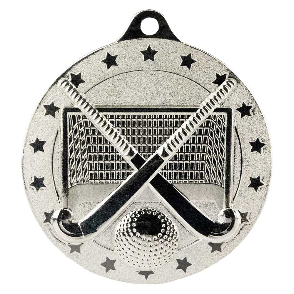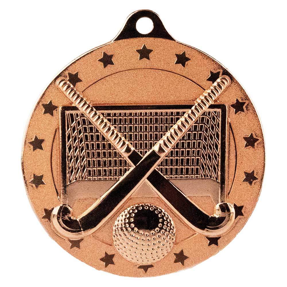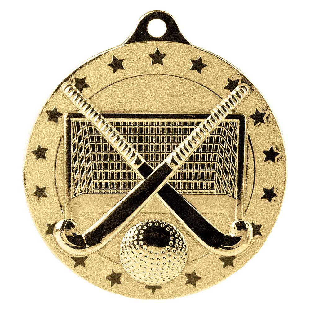A 5cm metal medal showcasing a hockey ball, crossed sticks, and net, framed by a cascade of stars for a striking finish.