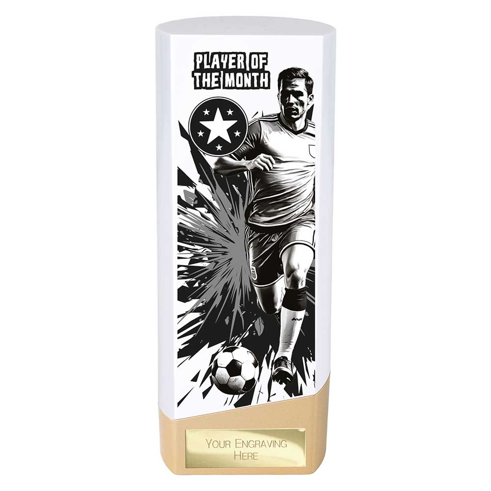 Celebrate monthly performance with the Prime Heavyweight Player of the Month Football Trophy Award. Crafted from durable plastic and finished in white and gold, this trophy features a footballer running with the ball against a smashed shard style background.