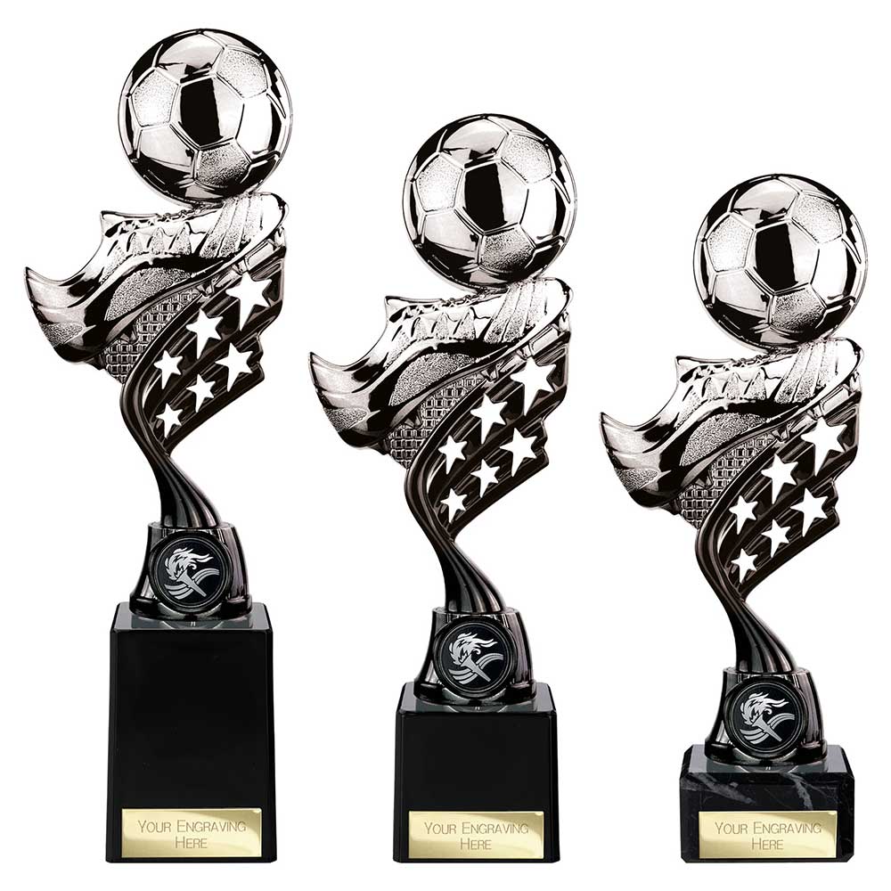 Celebrate football achievement with this striking silver and black trophy, featuring a ball balancing on a football boot atop a twisted pillar with cut-out stars, perfectly capturing the energy and movement of the game.