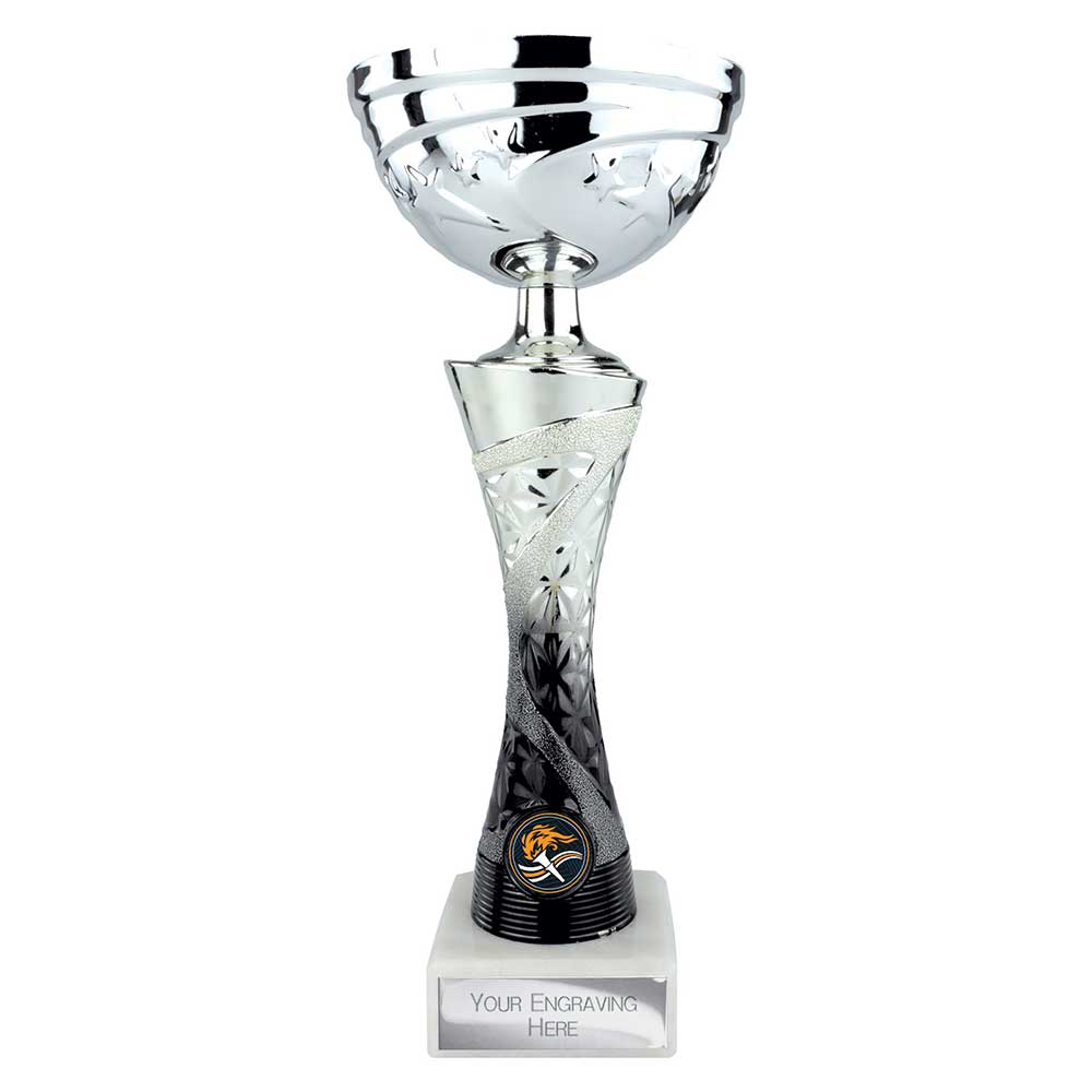 A striking combination of classic and contemporary, this trophy features a polished silver bowl with traditional handles, set atop a sculpted silver-and-black column with modern architectural detailing. Mounted on a solid black marble base, it offers a premium, weighty presentation perfect for high-achievement recognition.